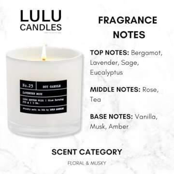 Show more Introducing Lulu Candles’ **Lavender Musk Luxury Scented Soy Jar Candle**, the perfect indulgence for your senses! Hand-poured in the USA, this 9 oz. candle embodies a unique blend of premium essential oils, meticulously crafted to create an unforgettable aromatic experience. With its soothing lavender musk scent, it transforms any space into a calming oasis, making it a must-have for relaxation and tranquility. Enjoy the benefits of a clean-burning candle made from vegan soy wax, ensuring that your environment remains free from toxins while enveloping you in a rich, long-lasting fragrance.