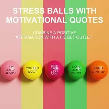 Show more Introducing the Lumarice Stress Balls (5 Pack), a versatile and fun solution for anyone seeking a moment of calm in their busy lives. Designed with vibrant colors and motivational quotes, these stress relief balls are perfect for both children and adults. Whether you’re looking for a way to channel anxiety or enhance hand strength, these balls cater to a wide range of needs.