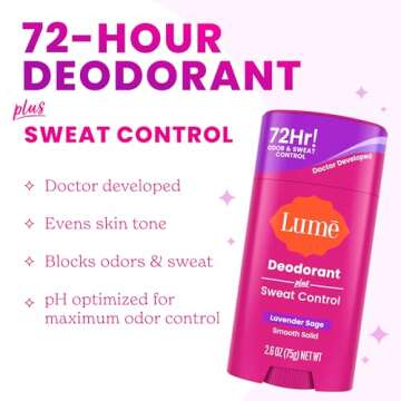 Show more Experience a new level of freshness and confidence with the Lume Deodorant Plus Sweat Control. This maximum strength antiperspirant is meticulously crafted to provide long-lasting protection against both odor and sweat for an impressive 72 hours. Its proprietary formula is designed not just to mask unpleasant smells, but to prevent them before they even begin, making it the ideal choice for anyone seeking dependable all-day freshness. Enriched with pH-optimized Mandelic Acid, this deodorant acts as a PREodorant, ensuring you feel clean and are odor-free at all times.