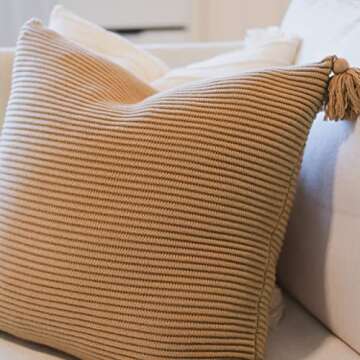 Show moreTransform your living space with the Lumi Living 100% Soft Cotton Raised Stripes Textured Rib Knit Throw Pillow Cover with Tassels. Designed for those who appreciate quality and style, this exquisite pillow cover combines a warm neutral mocha tone with camel and tan undertones, creating an inviting aesthetic that complements a variety of décor themes. Its sophisticated ribbed texture adds depth and dimension, making it an adaptable choice for modern, boho, farmhouse, or minimalist settings. Plus, the charming tassel details at each corner bring a whimsical charm that softens and elevates any room.