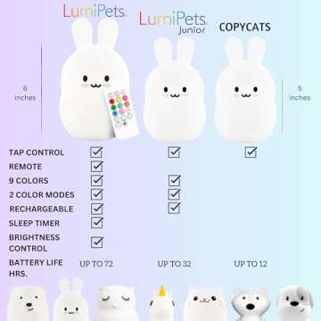 Show more Introducing the adorable LumiPet Color Changing Night Light, a delightful addition to any child's bedroom designed to soothe and comfort your little one as they drift off to sleep. This enchanting bedside lamp offers a charming way to ease nighttime worries with its friendly animal design, available in multiple captivating shapes, including a cute puppy. The LumiPet is not just a standard nightlight; it shines with nine soft, mesmerizing colors, making it a perfect companion during bedtime stories or nighttime cuddles.