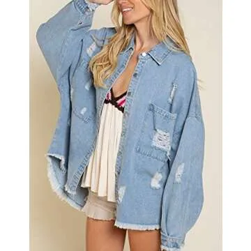 Show more Introducing the Lumister Women's Casual Oversized Soft Lightweight Distressed Jean Jacket—the perfect blend of vintage charm and modern comfort. Crafted from high-quality denim, this stylish jacket features a unique fringe ripped design that sets it apart. The button closure and lapel collar enhance its classic look, while the loose fit ensures ease and versatility. With its long sleeves and button cuffs, you'll feel comfortable and chic as you transition through the seasons. Plus, two chest pockets provide functional style, making it the ideal accessory for your casual outfits.