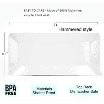 Show more Introducing the perfect addition to your serving collection: a stunning set of 2 white serving trays measuring 17 inches by 8 inches. Crafted from premium 100% Melamine, these trays combine durability with elegance, featuring a unique hammered design that is sure to impress. Unlike traditional glass or ceramic, these lightweight trays will not shatter, making them the ideal choice for both indoor and outdoor gatherings.