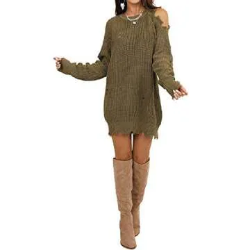 LunaJany Women's Winter Cold Shoulder Knit Distressed Pullover Tunic Long Sweater