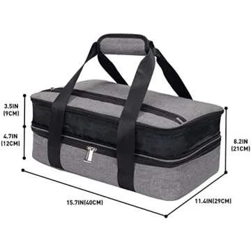 This insulated carrier boasts a dual-compartment design that measures 15.7”L x 9.84”W x 4.33”H, perfectly accommodating your 9"x13" baking dishes (4QT Pyrex standard glass bakeware). With a large main compartment and an expandable upper section, you can effortlessly pack two dishes of your choosing. The dual zipper design facilitates easy access, making your cooking experience hassle-free and enjoyable.