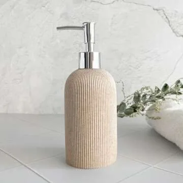 Show moreIntroducing the Lunestella Elegant Boho Beige Hand Soap Dispenser, a perfect blend of style and functionality. This beautiful piece features a stunning neutral beige color that complements any decor, from modern kitchens to chic bathrooms. With a classic bottle design that radiates sophistication, this soap dispenser is not just a practical accessory, but a stylish enhancement to your home. Inspired by the boho style, the unique sandstone texture adds warmth and a touch of earthy elegance, making it a delightful addition to your personal space.
