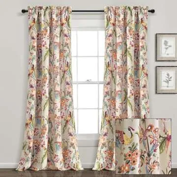 Lush Decor Dolores Light Filtering Window Panels, Pair, 52" W x 84" L, Neutral & Multi - Toile Curtains - Floral Bird Print - Grandmillennial & French Country Curtain - Cottage & Maximalist Home Decor