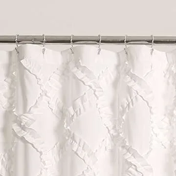 Show more Transform your bathroom into a chic oasis with the stunning Lush Décor Ruffle Diamond Shower Curtain. Crafted with a soft, 100% polyester fabric, this elegant shower curtain features a beautiful all-over ruffled diamond pattern that adds a delicate touch to any space. Whether you’re aiming for a farmhouse style, vintage chic, or a modern aesthetic, this curtain is the perfect accessory to enhance your decor. Measuring 72 x 72 inches, it comes with buttonholes at the top for easy installation with any ring or hook, making it suitable for various bathroom layouts and styles.