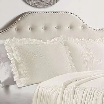 Show more Transform your bedroom into a haven of elegance with the Lush Decor Ruffle Skirt Bedspread Set. This exquisite 3-piece bedding set is designed to evoke a timeless charm that fits seamlessly into farmhouse, cottage, or bohemian styled homes. Crafted from remarkably soft crinkle microfiber, the bedspread flows effortlessly to the floor, accentuating your sanctuary with cascading ruffles that impart an airy, dramatic look. The soothing ivory hue adds a touch of sophistication, ensuring your space remains inviting and stylish.