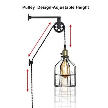 LUSTORM 1 Industrial Wall Sconce Lights Lift Pulley Design Vintage Farmhouse Wall Lamps for Living Room Decor, Retro Mounted Fixture with Wheel Pendant Lamp for Bedroom(No Bulb)