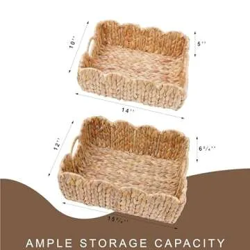 Show more Discover the perfect blend of style and functionality with our exquisite scalloped edge wicker basket set. Handcrafted from natural water hyacinth, these baskets are not only incredibly durable and sturdy, but they also boast a unique aesthetic appeal that enhances any decor. Each basket is a work of art, featuring scalloped edges and built-in handles, making them both visually striking and practical for everyday use.