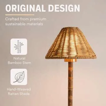 Show more Introducing the LUXELYKOS Bamboo Cordless LED Table Lamp—an exquisite fusion of style and functionality that transcends traditional lighting options. Standing at a thoughtful height of 15 inches, this lamp is not just about illumination; it’s a statement piece designed to elevate your home decor. The all-natural bamboo construction paired with a stunning iron base in a chic gold finish exudes elegance while promoting sustainability. Whether you place it on your nightstand, dining table, or patio, its unique design brings a warm, organic aesthetic to any space. With a lightweight body, you can easily transport it from room to room, enhancing your ambiance wherever you go.