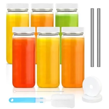 Luxfuel 16oz Glass Juicing Bottles Set - 6 Pack with Airtight Lids & Straws