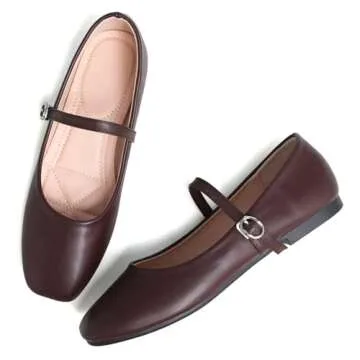 LUXINYU Mary Jane Flat Shoes for Women Soft Leather Square Toe Adjustable Buckle Strap Coffee Ballet Dance Shoes,Coffee 8