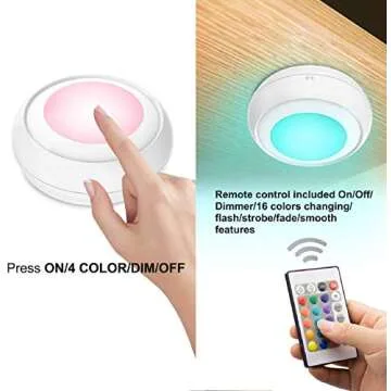 LUXSWAY Battery LED Color Puck Lights Stick Up Push Lights with Remote 16 Color Changing LED Fairy Lights Wireless Tap Lights Dimmable Under Cabinet Light Battery Powered RGB Night Light -4Pack
