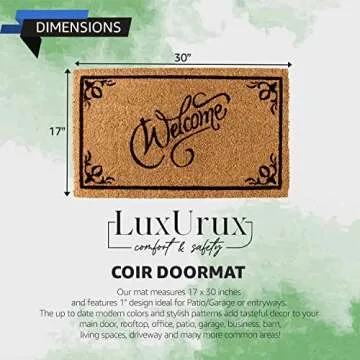 Introducing the **LuxUrux Coco Coir Welcome Mat**, a seamless blend of functionality and charming aesthetics. Made from **100% natural coco coir**, this mat radiates organic elegance, making it the perfect accessory to elevate your entryway. Its artistic ‘Welcome’ design is not only visually striking but also imparts a warm and inviting atmosphere for your guests, making them feel right at home even before they step inside. This heavy-duty mat, measuring **17'' x 30''**, is designed to endure the demands...