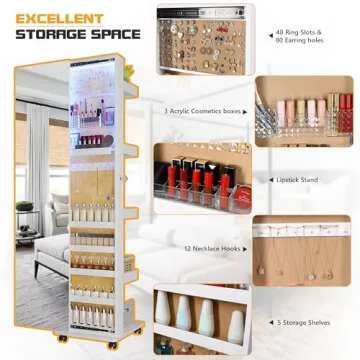 Show more This LED jewelry armoire is more than just a storage solution; it's a stylish haven for all of your precious accessories. With its built-in makeup mirror and innovative 3-color dimmable fill light design, this cabinet provides the ideal ambiance to enhance your beauty routine. Imagine getting ready for the day or preparing for a night out, all with the perfect lighting at your fingertips.