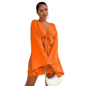 Show more Introducing the LYANER Women's 2 Piece Outfits Tie Knot Front Bell Long Sleeve Crop Top and Mini Skirt Set in vibrant orange, a perfect blend of chic, sexy, and sweet style that is designed to turn heads. This stunning outfit features a beautifully crafted V-neck crop top accented with a self-tie bow at the front, enhancing your silhouette and adding a touch of charm. The bell long sleeves offer a soft and feminine flair while complementing the alluring deep V-neck design. Made with high-quality fabric, this set is not only stylish but also comfortable, giving you the confidence you need for any occasion.