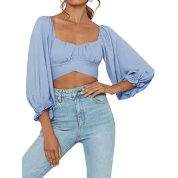 LYANER Women's Cute Off Shoulder Long Sleeve Self Tie Knot Crop Tube Top Blouse Blue Medium