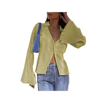 LYANER Women's Deep V Neck Button Front Bell Long Sleeve Blouse Shirt Top Yellow Medium