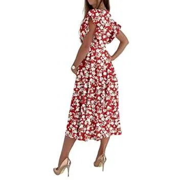 Show more Step into elegance and style with this stunning deep v neck A-line midi dress, perfect for any occasion where you want to feel both beautiful and confident. Crafted with care, this dress features flutter ruffle sleeves that gracefully highlight the chest area, offering a feminine touch that is sure to turn heads. Made from soft material, this dress promises comfort as you dance the night away or mingle with friends during evening events. The warp front v neckline paired with an invisible zipper at the back adds a modern twist to a classic silhouette.