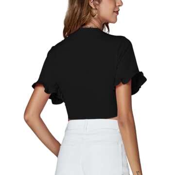 LYANER Women's Deep V Neck Tie Front Knot Ruffle Short Sleeve Crop Top Club Blouse Black Medium