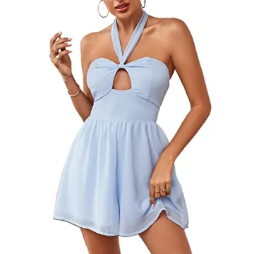 Show moreIntroducing the LYANER Women's Halter Neck Cutout Backless Sleeveless Romper, a must-have addition to your spring and summer wardrobe! This chic light blue playsuit features a stylish halter neck design with a stunning back cutout that enhances your silhouette, while the shirred high waist provides both comfort and a flattering fit. Made from lightweight fabric, this romper not only looks fabulous, but it also feels breathable and perfect for those warmer days.