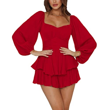 The lantern long sleeves and flattering low square neckline create a captivating silhouette, allowing you to transition effortlessly from a casual brunch to a glamorous evening event. Tailored with a double-layer ruffle hem, this romper offers playful elegance. The versatile elastic neckline allows for creative styling—wear it off-shoulder for a flirty vibe or keep it classy with sleeves worn up. With a practical back zipper closure, slipping into this flattering ensemble has never been easier.