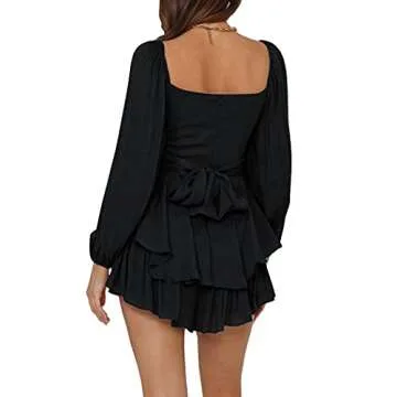 LYANER Women's Jumpsuit Lantern Long Sleeve Ruffle Layer Tie Mini Short Romper Solid Black Medium
