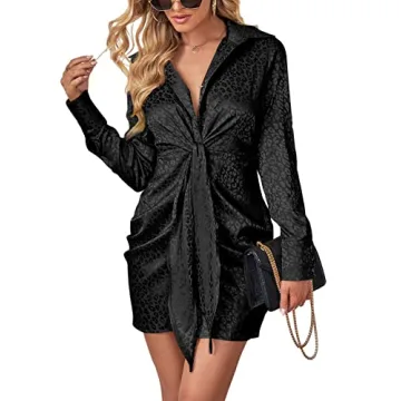 Show moreElevate your wardrobe with the LYANER Women's Leopard Satin Deep Collar V-Neck Tie Front Long Sleeve Short Party Dress. This captivating piece is designed for those who crave a blend of style, comfort, and versatility. Crafted from luxurious printed jacquard fabric, this dress features a stunning leopard satin pattern that embodies fashion-forward thinking. The turn down collar and open front pullover give it a contemporary edge, while the flattering slim fit and above-knee length enhance your silhouette, making it perfect for any occasion, from parties to casual outings.