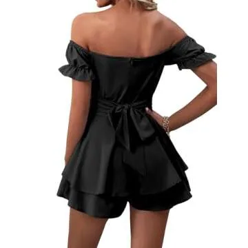 LYANER Women's Off the Shoulder Wrap Tie Up Back Ruffle Short Sleeve Romper Short Jumpsuit Black Small
