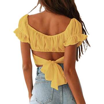 Introducing the LYANER Women's Ruffle Short Sleeve Tie Up Back Crop Top, a stunning addition to your wardrobe designed to blend comfort with elegance. This versatile crop top features a playful ruffle cuff and a v neckline, allowing you to wear it either as an off shoulder or as a classic scoop neck. With its delightful self-tie bow knot at the back, this yellow crop top adds an element of fun to your outfit while maintaining an air of sophistication.