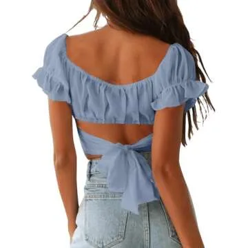 Crafted with a self-tie bow knot at the back and a solid color finish, this top boasts a unique warp hem design and ruffled short puff sleeves that add a touch of elegance to your outfit. Ideal for the warmer months, it shines during summer and spring outings, making it your go-to option for vacations, beach trips, parties, or casual outings.