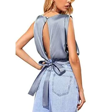 LYANER Women's Satin Sleeveless Self Tie Boat Neck Fashion Crop Top Blouse Blue Small