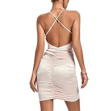 This above-knee length, slim-fit mini bodycon dress offers a sexy and elegant style that can transition effortlessly between formal and casual occasions alike. Whether you're dressing for a cocktail party, banquet, wedding, prom, or an evening out at the club, this satin plain sleeveless bodycon mini dress with its ruched design and crisscross back detail will ensure you stand out in the crowd.
