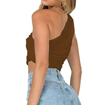 LYANER Women's Sexy Ruched One Shoulder Sleeveless Crop Top Strappy Cami Tank Brown Small