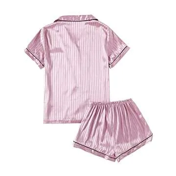 LYANER Women's Striped Silky Satin Pajamas Short Sleeve Top with Shorts Sleepwear PJ Set Dusty Pink#2 X-Small