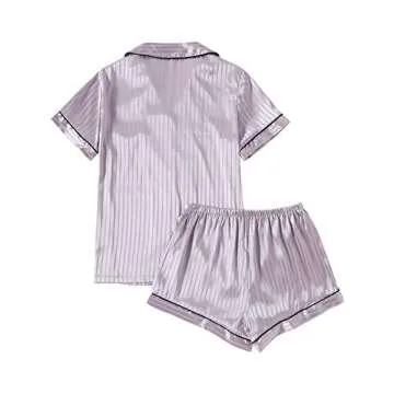 LYANER Women's Striped Silky Satin Pajamas Short Sleeve Top with Shorts Sleepwear PJ Set Light Purple X-Small