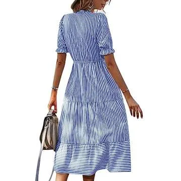 LYANER Women's V Neck Stripe High Waist Puff Short Sleeve Tiered Ruffle Hem Swing Midi Dress Blue Small