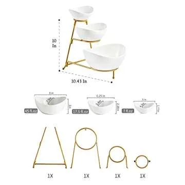 Show moreEnhance your entertaining experience with the LYEOBOH 3 Tier Serving Bowls Set, a beautifully designed serving tray that transforms any gathering into a culinary showcase. This set features three elegantly crafted porcelain bowls—each varying in size with capacities of 45 fl. oz, 17.5 fl. oz, and 7 fl. oz—perfect for holding everything from delicious pastries to savory snacks. Not only does this striking set look stunning, but it also adds a touch of sophistication to your dining table. Its durable construction ensures you can confidently use it for any occasion, while the gorgeous gold accents on the stand highlight its luxurious design.