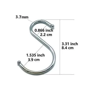 Show moreThe Lysas S shape hooks are an essential addition to any home, office, or workshop, providing a practical yet stylish solution for your hanging needs. Crafted from durable metal, these hooks are not only sturdy; they can bear a weight of over 30 lbs, making them ideal for hanging various items. With a unique S shape design, they effortlessly fit over poles of different sizes, accommodating up to 1.53 inches / 3.9 cm on the larger end and 0.87 inches / 2.2 cm on the smaller end.