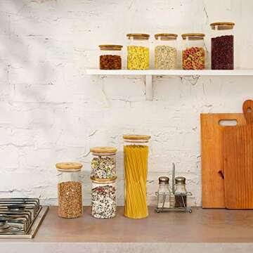 This versatile set includes nine airtight glass jars of varying heights and widths, ranging from 3.7 inches in diameter to heights of 11, 7.2, 5.4, and 3.7 inches. Perfect for storing pasta, rice, nuts, grains, and more. Beyond food storage, they can also be utilized for holding wine, honey, or even bathroom items like cotton swabs and cosmetic pads.