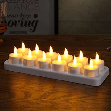 Show more Discover the charm of ambiance with our exceptional Complete Set of Rechargeable Tea Light Candles. This thoughtfully curated package includes 12 flickering battery-operated candles, 12 frosted plastic candle holders, a charging base, and a UL power adapter, making it the perfect addition to any home. These eco-friendly candles are designed for both safety and convenience, eliminating the need for traditional wax candles while mimicking their radiant glow. With a simple USB charging cable included, these candles are ready to light up your space in no time!