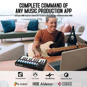Show more Unleash your creativity with the K5 MIDI Keyboard - a robust and versatile USB-powered MIDI controller that is a game changer for songwriters and beat makers alike. With 25 mini velocity-sensitive keys, this powerful keyboard allows for precision control in your studio productions. Its compact and portable design makes it a perfect companion for musicians on the go, ready to create stunning melodies anywhere from your home studio to a bustling café. Equipped with an impressive built-in 2,000 mAh battery, this smart keyboard provides up to 16 hours of wireless functionality via Bluetooth, allowing for seamless integration with your devices.