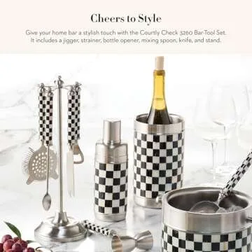 Introducing the MACKENZIE-CHILDS 3260 Bar-Tool Set, a stunning five-piece collection that combines elegance and functionality for the at-home cocktail enthusiast. Crafted in the distinctive Courtly Check pattern, this barware set is more than just tools—it's an invitation to elevate your cocktail-making experience. Each set includes a high-quality stainless-steel jigger for precise measurements, a strainer to serve up cocktails flawlessly,...