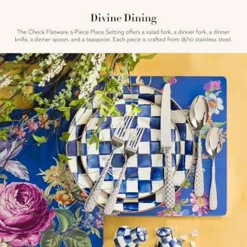 MACKENZIE-CHILDS 5-Piece Flatware Set, Cute Silverware Set with Salad Fork, Dinner Fork, Knife, Spoon, and Teaspoon, Check