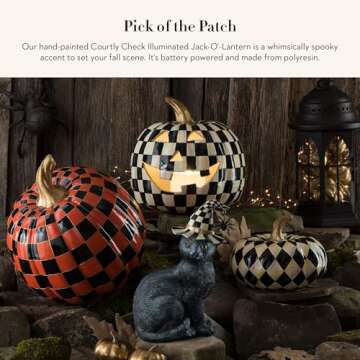 Show moreTransform your space into a warm and inviting autumn haven with the exquisite MACKENZIE-CHILDS Courtly Check Illuminated Jack-O’-Lantern. This decorative light-up pumpkin is your go-to centerpiece for fall gatherings and Halloween celebrations. It features an enchanting black-and-white checkered pattern, perfectly complemented by a charming carved smile that brings joy to any room. Designed to illuminate your decor, this piece uses LED technology to create a gentle and inviting glow, enhancing the ambiance of your home during the festive season. The added elegance of a gold stem not only accentuates the pumpkin’s classic design but also brings a touch of sophistication that makes it stand out from ordinary decor.