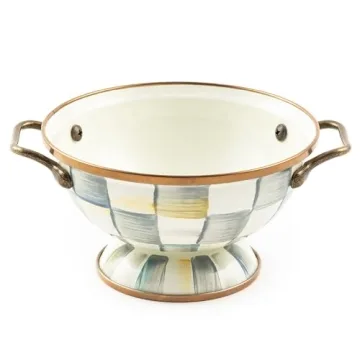 Show moreIntroducing the exquisite MACKENZIE-CHILDS Enamel Simply Anything Bowl, where artistry meets functionality. This captivating bowl is not merely a kitchen accessory; it’s a statement piece that embodies elegance and versatility. Crafted with meticulous attention to detail, it serves an array of purposes—from a charming salad bowl to a stylish serving dish, or even a decorative fruit bowl that enhances your kitchen decor. Its stunning gray-and-white checks, accentuated by a bronzed stainless-steel rim, glimmer with sophistication, making every meal a delightful experience.
