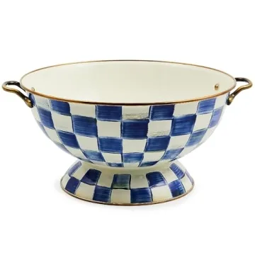 Show moreDiscover the charm and versatility of the Mackenzie-Childs Enamel Bowl, an exquisite offering from this highly acclaimed brand. Perfect for both hosting grand gatherings and enjoying intimate dinners at home, this serving bowl seamlessly blends functional design with unparalleled beauty. With its eye-catching blue-and-white Royal Check pattern, it radiates a delightful atmosphere that enhances any dining setting. This bowl is meticulously crafted from a hand-glazed heavy-gauge steel underbody, ensuring durability while effortlessly standing out as a luxurious kitchen accessory.
