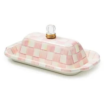 Currently, the Rosy Check Butter Holder features a unique pink-and-white check pattern, but MacKenzie-Childs has a variety of other designs available.